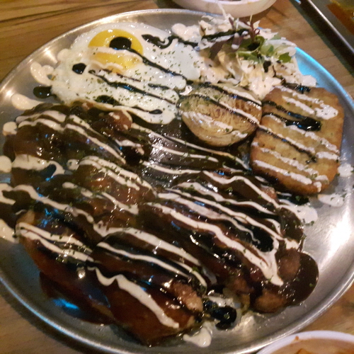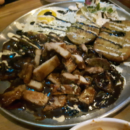 두번째 안주는 미친 목살 스테이크 이름처럼 목살도 양이 엄청나고 위에는 딱 보기에도 달달해 보이는 데리야끼 소스와 마요네즈 소스가 듬뿍 뿌려져 있는 것 같다.