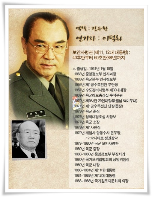 1980년 5.18 광주 민주화운동을 무력으로 제압하여 정권을 장악한 전두환은 그해 8월 대장 진급과 함께 군복을 벗고 통일주체 국민회의에서 제11대 대통령으로 선출이 된다.