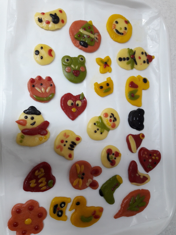 이 모습은 토이 쿠키를 굽기 전의 모습입니다. 굽기 전에는 부드러운 쿠키 반죽이기 때문에 더욱더 선명하게 보이지만 쿠키를 굽고 나면 살짝 부풀어 오르면서 모양이 조금 변하는 것 같지만 그래도 원래의 형태는 간직하고 있답니다.