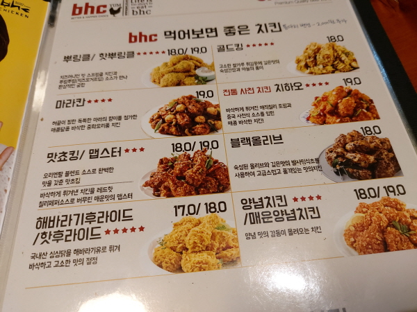 bhc 치킨전문점에는 이밖에도 순살, 윙봉, 마라칸, 맛쵸킹 등 다양한 메뉴들이 있습니다. 닭 한 마리보다 특수부위인 다리나 윙봉을 좋아하는 사람들을 위해서 윙 스타 시리즈도 출시가 된 만큼 치킨의 좋아하는 부위만 주문해서 먹을 수 있는 것도 장점이라 할 수 있습니다.