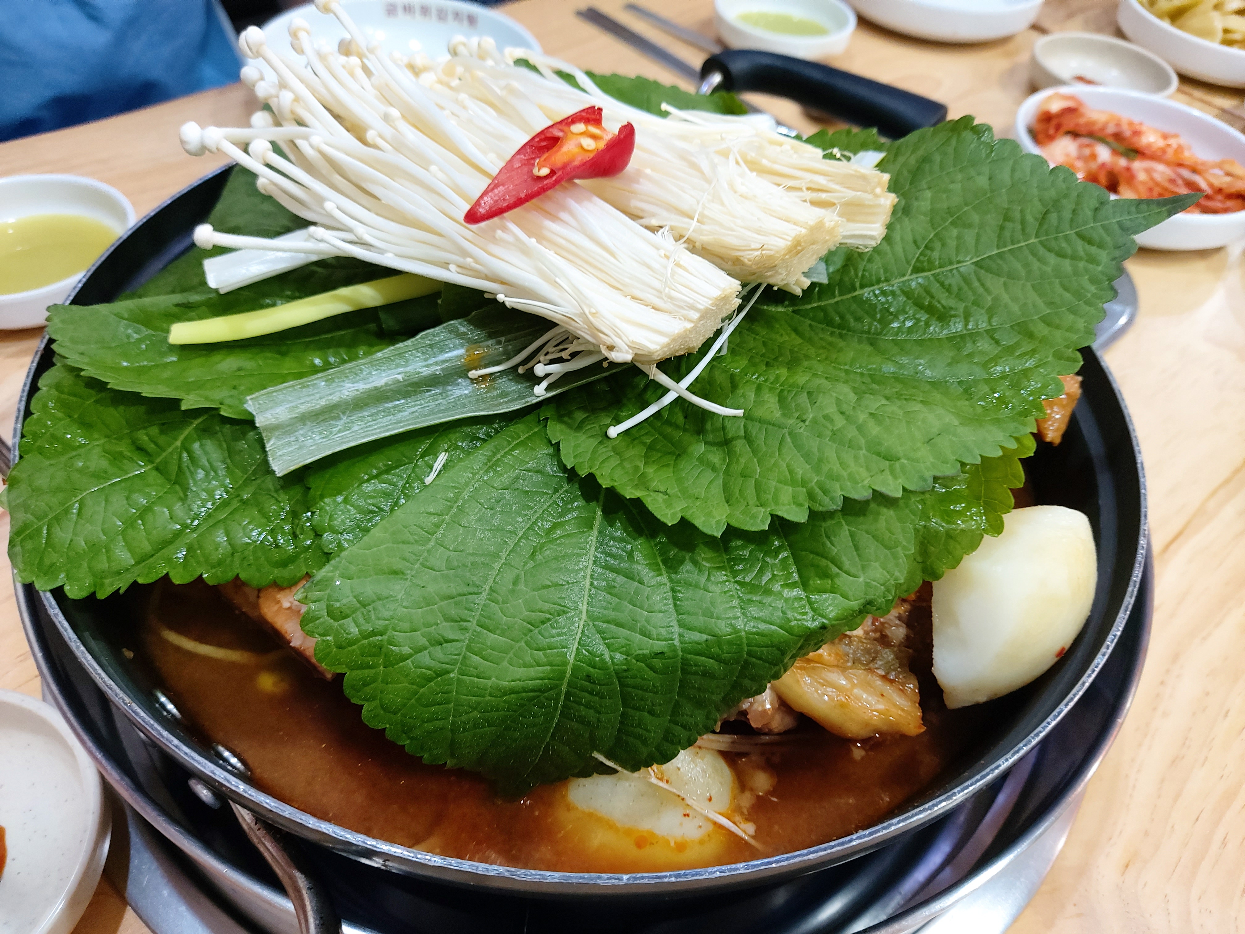 주문한 감자탕이 나왔다. 대자를 주문한 만큼 큰 냄비에 가득 찰 정도로 가득 담겨서 나왔다.