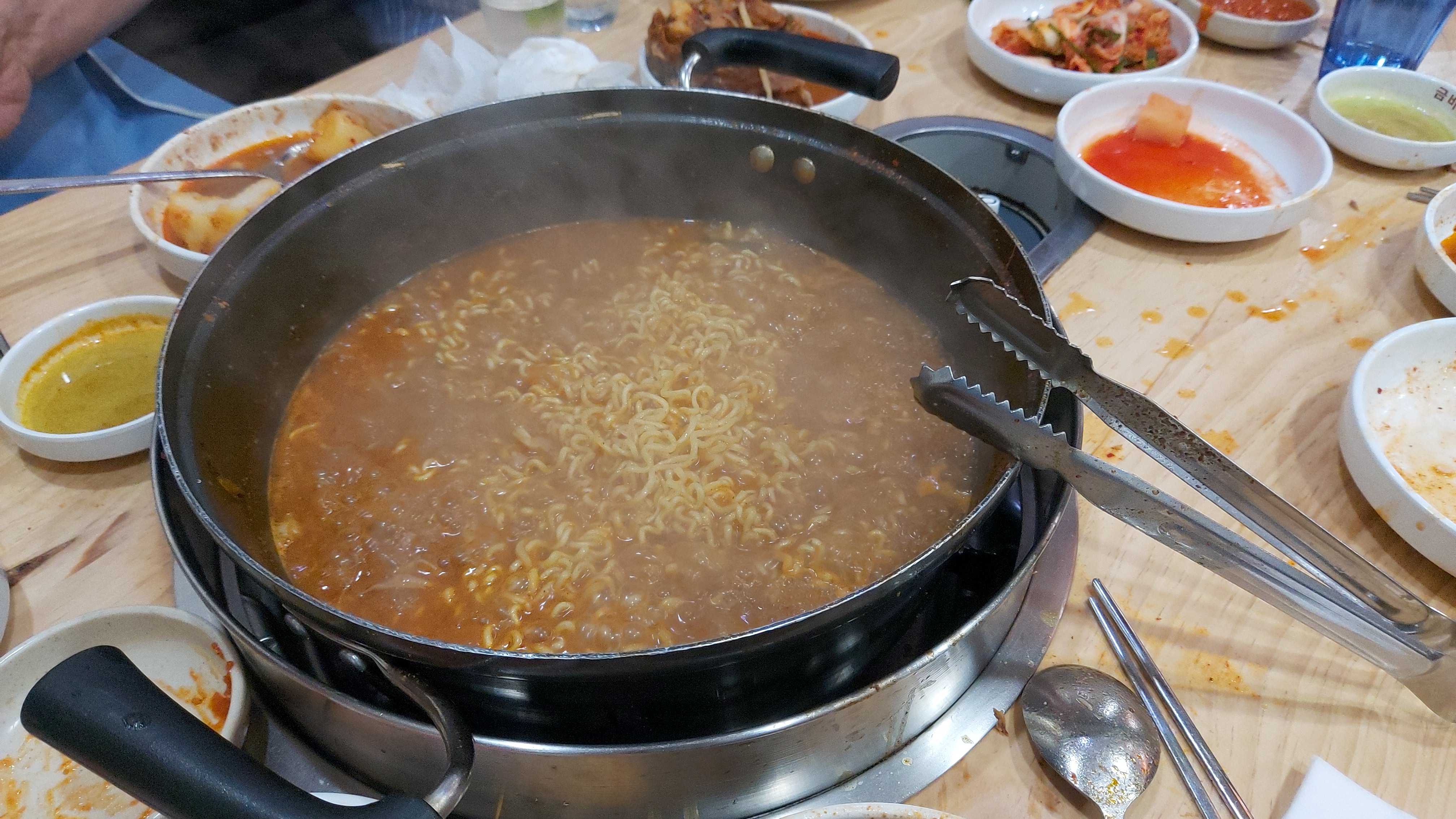 한참을 감자탕과, 수제비를 먹고 마무리로 라면사리를 추가해서 먹었다. 김이 모락모락 피어나면서 카메라에 수증기가 가득 찬 모습까지 볼수 있었다.
